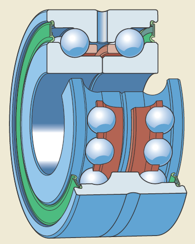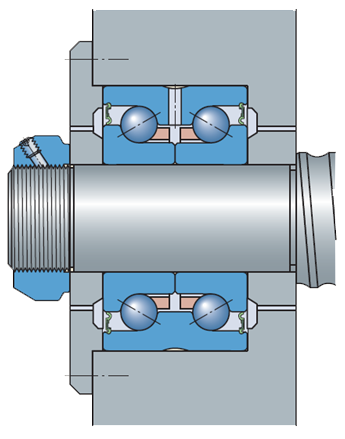 BEAS系列軸承相當(dāng)于兩套單向軸承背對(duì)背配置的結(jié)構(gòu)。其不可分離,有一個(gè)外圈和兩個(gè)內(nèi)圈,接觸角為60°。軸承可以承受徑向和兩個(gè)方向的軸向載荷。預(yù)載荷(在工廠預(yù)先設(shè)置)通過(guò)用如精密鎖緊螺母 并緊絲杠驅(qū)動(dòng)軸上的兩半內(nèi)圈得到。這些軸承的外圈上有標(biāo)準(zhǔn)化的環(huán)形槽和潤(rùn)滑油孔,在需要的時(shí)候,可以非常容易