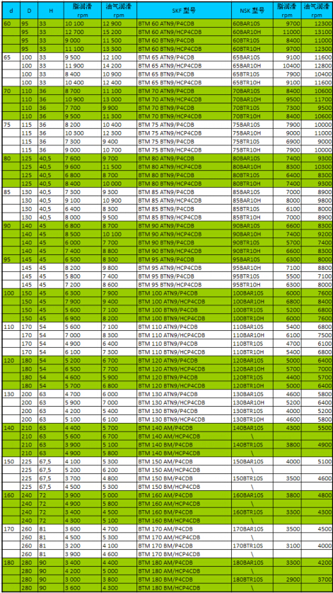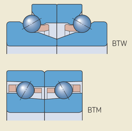 新設(shè)計的BTM系列超精密軸承能夠承受更快的轉(zhuǎn)速,速度能力提高6%-12%,具體視尺寸而定。即使在更快的轉(zhuǎn)速條件下,仍能將發(fā)熱量降到低,并保證高承載能力、維持高系統(tǒng)剛性。BTM系列軸承可與位于同樣軸承座中的NN 30 K或N 10K 系列圓柱滾子軸承組合安裝使用。這些新設(shè)計的軸承在尺寸和功能兩方面均能與原有設(shè)計的BTM系列軸承互換。BTM和BTW系列軸承擁有同樣的內(nèi)徑和外徑。但是BTM系列軸承的質(zhì)量要輕25%,故其更適用于緊湊型配置。其承載能力和軸向剛度低于BTW系列,但可在更高轉(zhuǎn)速下運(yùn)行。